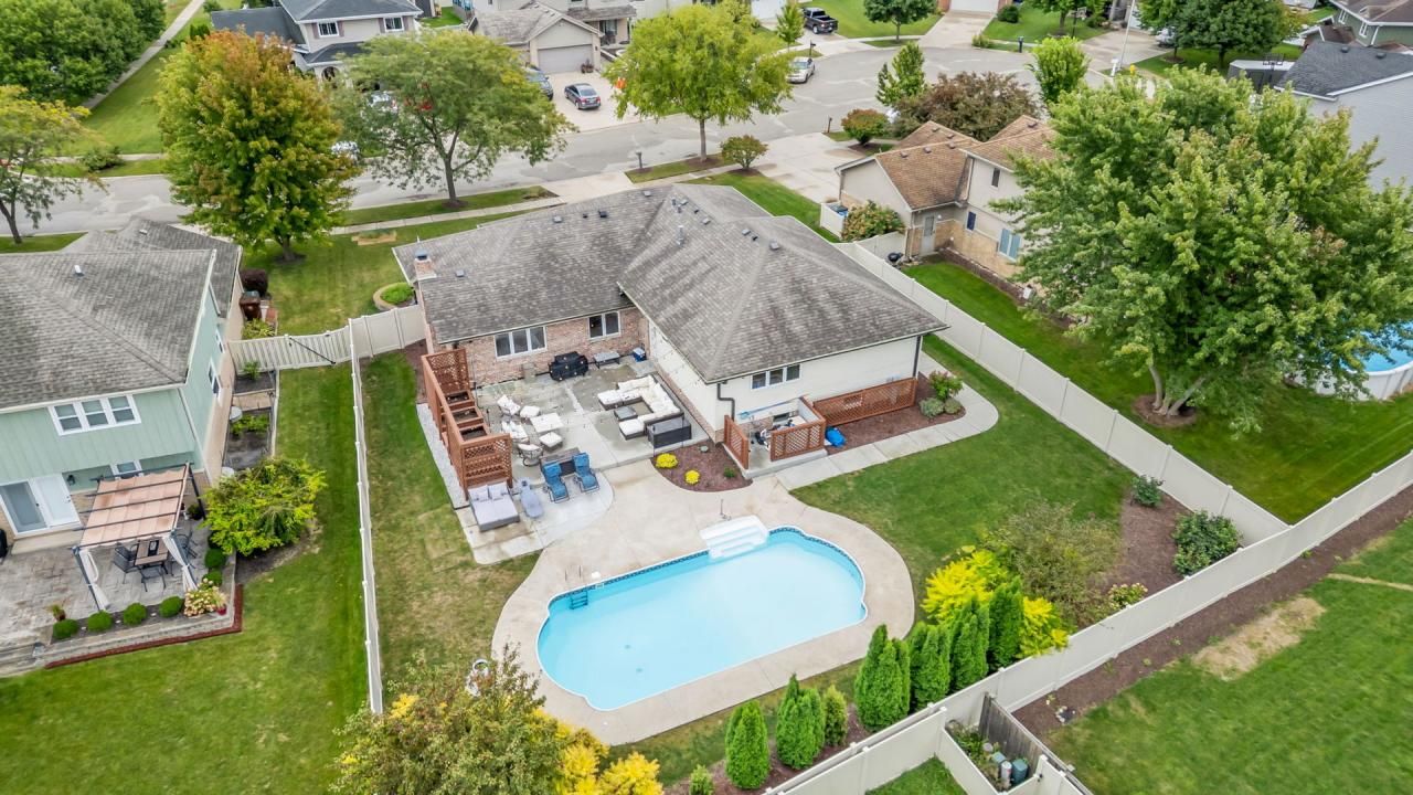 Welcome to this beautifully updated 6 bedroom, 3.5 bath step ranch located on a quiet cul-de-sac in desirable Indian Ridge. Every detail has been thoughtfully renovated with custom touches throughout. The open concept main level features vaulted ceilings, hardwood floors, and a brick fireplace, creating a warm and inviting living space. The chef's dream kitchen is equipped with high end Thermador appliances, a 6-burner range with griddle, double ovens, quartz counters, a custom island, pot filler, and a Fisher & Paykel double-drawer dishwasher. A spacious mud/laundry room sits off the attached 2 car garage, complete with abundant cabinetry, stainless utility sink, and built in bench with storage. Upstairs, you'll find generously sized bedrooms with newer carpet, including a primary suite with walk-in closet and private bath. The finished lower level is a true extension of the home, boasting 10 ft ceilings, a wet bar with beverage fridge, dishwasher, and ice maker, plus a home office, and three additional bedrooms with three new egress windows. The bathroom has been renovated to complement the updated basement. Step outside to a backyard oasis featuring a professionally landscaped yard, extended concrete patio (2025), vinyl fence (2021), and a BEAUTIFUL in ground pool. Recent pool updates include a newer liner, pump, filter, heater, IntelliBrite lighting system, and controls. Major improvements include: roof, gutters, soffit, and fascia (2020), sump pump with battery backup (2024), ejector pit (2023), and more. Additional upgrades include custom window treatments, Nest thermostat, security system, water softener, whole-house fan, and radon mitigation system. This home blends style, function, and entertainment inside and out, truly move in ready! Multiple offers received. Highest and best called for 9/15 @4pm.