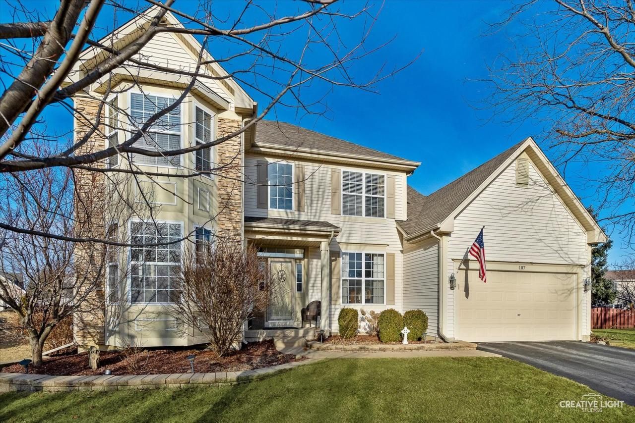 These original owners put thought into everything they did when this home was built. The lot was chosen because it is located on a 'cul de sac' which allows for a supersized fenced in yard and 3 car tandem garage! This backyard is outstanding with its custom designed, professionally built, concrete patio with brick paver accents and 3 separate gathering areas. There is a built in, natural gas / wood burning firepit, a sitting area, and natural gas grill with a bar area for sitting while the chef is grilling. There are 2 outdoor Bose speakers, exterior landscape lighting and window well covers. Inside the sliding glass door is the kitchen which opens to the eating area, stainless appliances, an island, updated lighting, views of the backyard, a planning desk and a butlers pantry. The beautiful fireplace is the focal point in the spacious family room. This room has wall mounted Bose surround speakers that will stay with the home, crown molding, recessed lighting and custom blinds. Rounding out the first floor is the living room, a 1/2 bathroom and a laundry room complete with a laundry chute, cabinets, new (Oct'24) washer & dryer, and access to the insulated 3 car tandem garage. The basement is finished with a custom built (almost finished) wet bar, a Rec Room, game area, utility room, storage room and one more room that can be a 5th bedroom, a sitting area, or even a large office. Included are 4 built in ceiling speakers, individual stereo system, and newer carpet (2019). Utility closet contains the newer furnace and humidifier, plus the hot water heater, whole house water filter, and whole house water softener. A great place to celebrate with family & friends! This home has 4 bedrooms upstairs. The master suite has its own private bathroom, sitting area and giant, custom designed walk-in closet. The other 3 bedrooms are generous in size, have ample closet space and share the newly updated hallway bathroom. There is even a little reading nook at the top of the stairs! The furnace and A/C were new in 2022, the water heater was new in 2021, and the roof was replaced in 2017. All the big ticket items are done and ready for you to just move in and begin enjoying! Welcome home to 107 Sutton Ave, Sugar Grove!